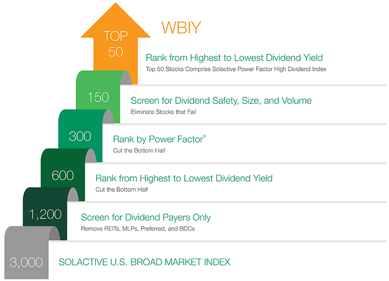 WBIY is designed to track the Solactive Power Factor High Dividend Index. The Index screens for securities based on three fundamental value characteristics, or “Power Factors”: